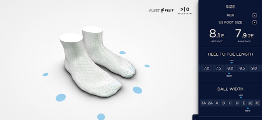 Earlier today, I went to the Fleet Feet on J Street in Sacramento. Boy was that a 21st-century shoe fitting experience! Maybe I’m a caveman, but the concept of taking a 3D scan of my feet tickled (and impressed) me quite a bit. The machines scanned the works: foot size, heel to toe length, ball width, ball girth, arch height, instep height, heel width, you get the picture. In fact, you can see a picture below.
